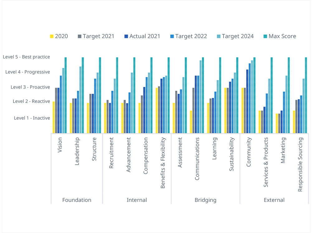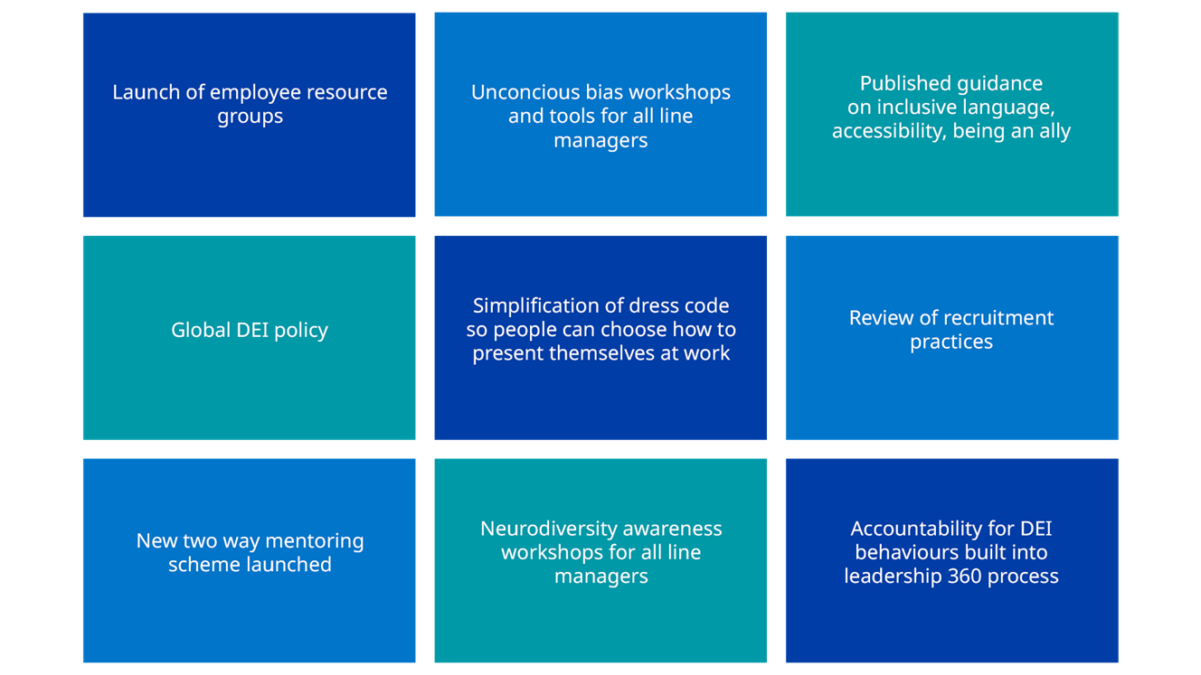 Each year we use an external DEI benchmark index to measure our progress in every aspect of our business. We aim to publish the results and our targets both internally and externally to ensure we are accountable against our commitments.